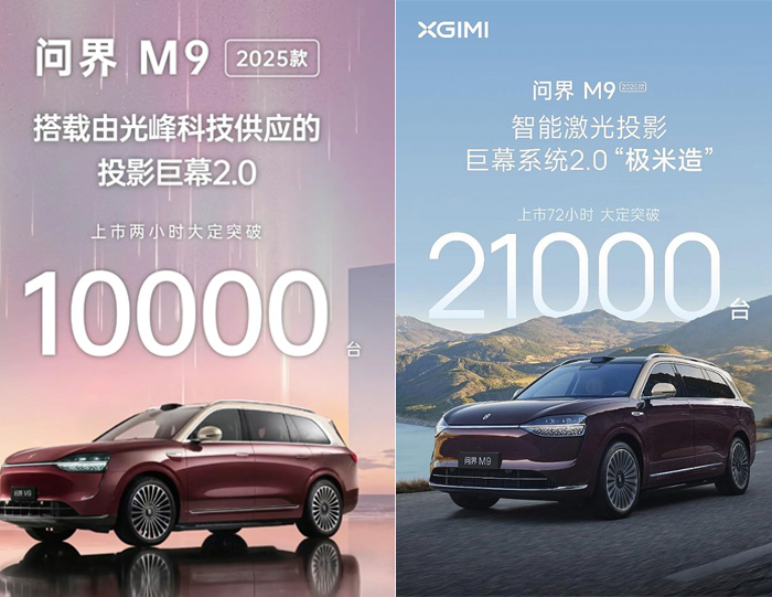 截止3月23日,问界 M9 2025 款上市 72 小时大定冲破 21000 台。问界M9,做为鸿蒙智行旗下的全景聪慧旗舰SUV,自问世以来便以其前瞻性的设想、杰出的机能表示以及人道化的智能设置装备摆设,从头定义了奢华出行的尺度。而此次问界M9选择取投影范畴的两大巨头,极米科技取光峰科技联袂合做,配合打制智能激光投影巨幕系统2。0。