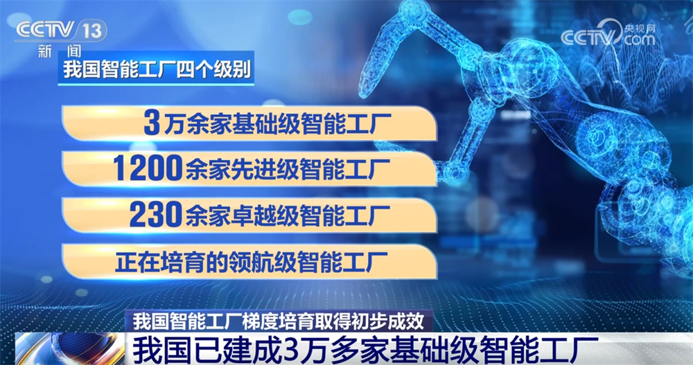 我国将智能工场分成四个级别,包罗3万余家根本级智能工场、1200余家先辈级智能工场、230余家杰出级智能工场,还有正正在培育的领航级智能工场。最新数据显示,目前我国已建成3万多家根本级智能工场,笼盖80%制制业大类。