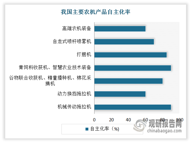 成长到目前我国已成农机制制和利用大国,2023年我国农机保有量已达2亿台套,农业分析机械化率达到74%。从次要农机产物自从化率来看,到2023年我国机械传动拖沓机已达90%,动力换挡拖沓机跨越60%,谷物结合收成机、精量播种机、棉花采摘机自从化率均达80%,青饲料收成机、聪慧农业手艺配备(传感器、算法模子)达到90%,打捆机为85%,自走式喷杆喷雾机为70%,高端农机配备达60%。