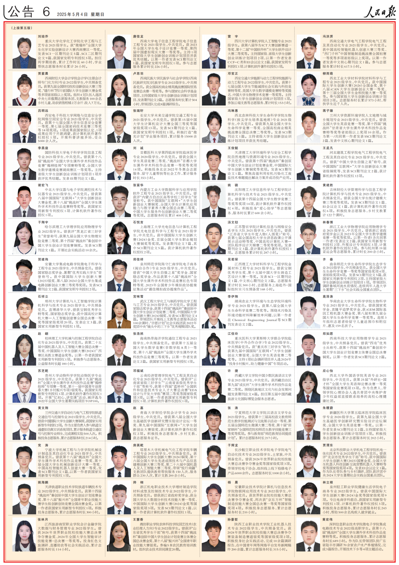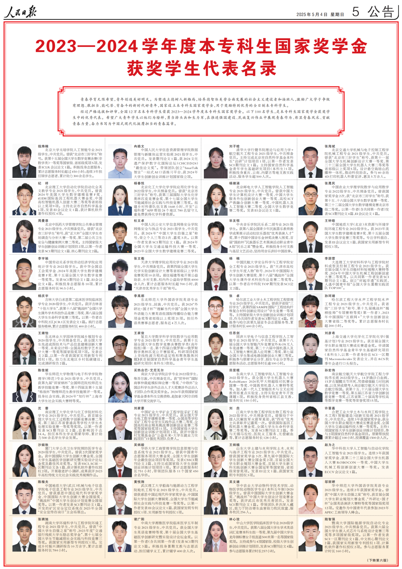 5月4日,《》专版登载《2023—2024学年度本专科生国度学金获学生代表名录》,展现本专科生国度学金获学生中的100名优良代表的风度。